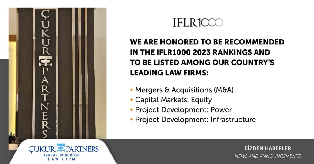 Çukur & Partners has been ranked and recommended among leading law firms of Turkey at the practices of Mergers & Acquisitions (M&A), Capital Markets:Equity, Project Development:Power, and Project Development:Infrastructure by IFLR1000 2023 report.